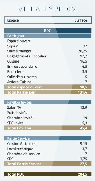 La villa est conçue sur 800 m2 avec une surface habitable de 336 m2. Sa conception a été inspirée du mode de vie Akan. Elle est composée de deux (2) blocs autour d’une terrasse d’accueil couverte.